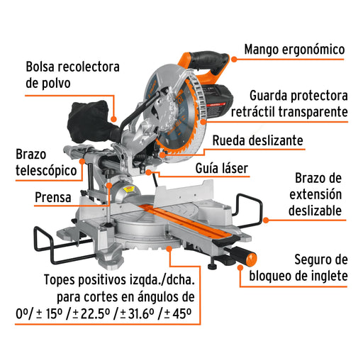 Sierra de inglete 10', 1900 W telescópica compuesta, Truper 16869 SINCO-10X2