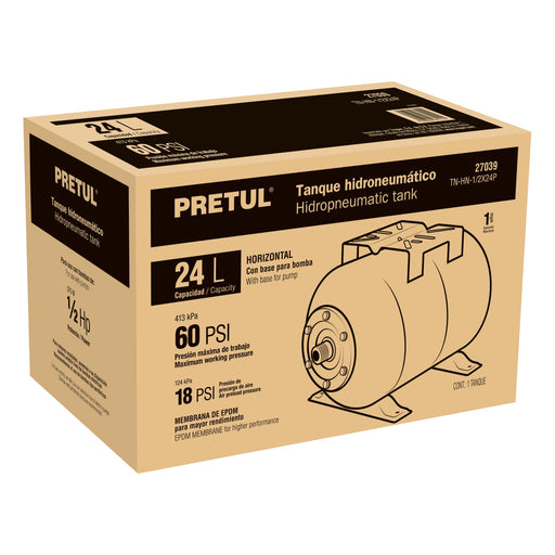 Tanque hidroneumático horizontal, 24 litros, Pretul 27039 TN-HN-1/2X24P