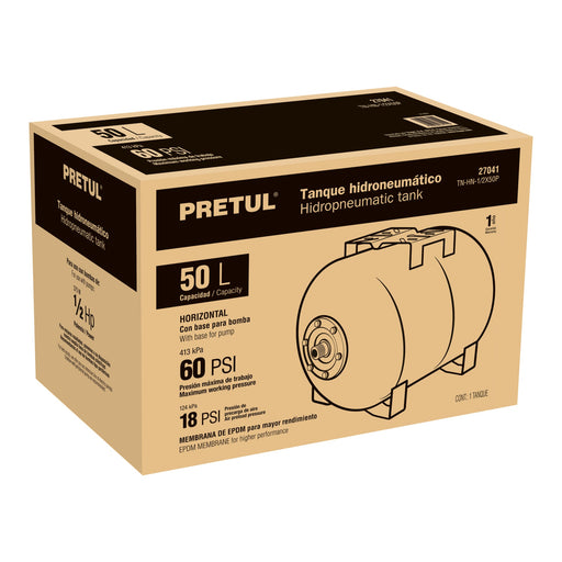 Tanque hidroneumático horizontal, 50 litros, Pretul 27041 TN-HN-1/2X50P
