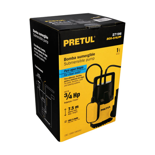 Bomba sumergible, tipo bala, 3/4 HP, agua limpia, Pretul 28204 BOS-3/4LMP