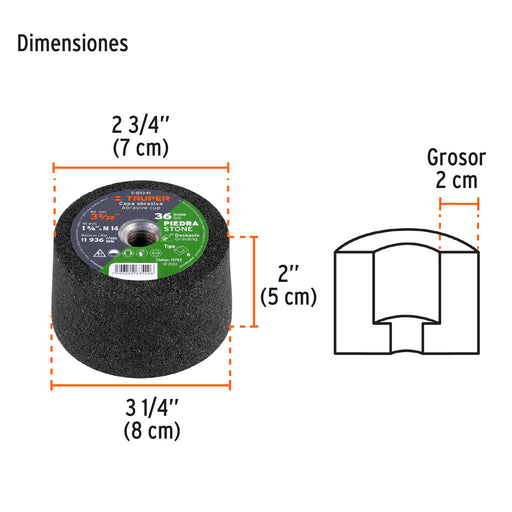 Copa desbaste de piedra 3-5/32' grano 36, eje M14, Truper 13783 C-1293-PI