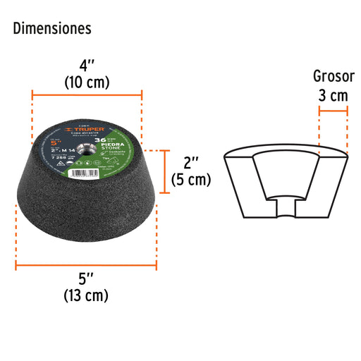Copa desbaste de piedra 5' grano 36, eje M14, Truper 13792 C-349-PI