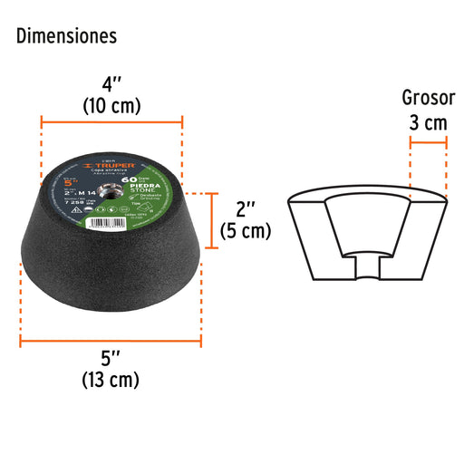 Copa desbaste de piedra 5' grano 60, eje M14, Truper 13793 C-351-PI