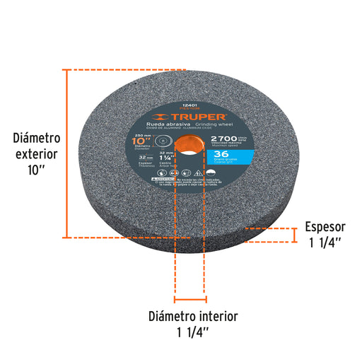 Rueda abrasiva p/esmeril 10X1 1/4', óxido aluminio, grano 36 12401 PIES-1036