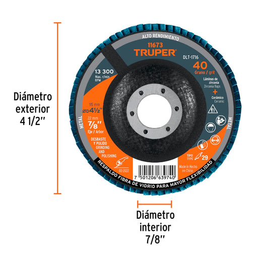 Disco 4-1/2' laminado grano 40 centro 7/8', Truper 11673 DLT-1716