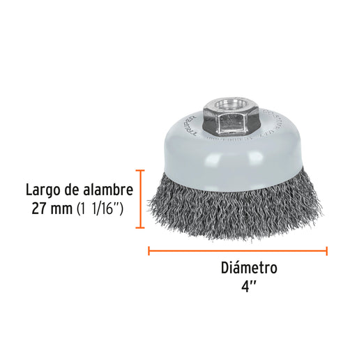 Carda copa 4' alambre ondulado fino, eje 5/8'-11, Truper 11529 CO-510
