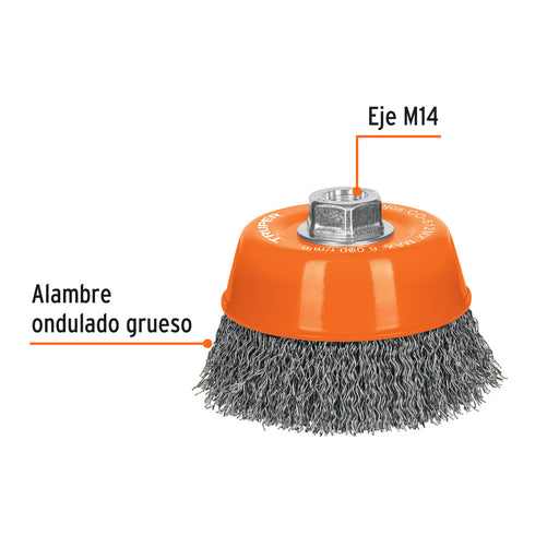 Carda copa 5' alambre ondulado grueso, eje M14, Truper 17534 CO-512MX
