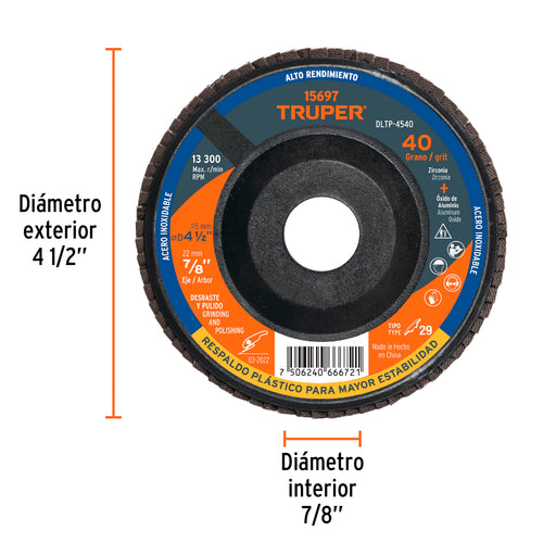 Disco laminado 4', grano 40 centro 5/8', Truper 11670 DLT-1700