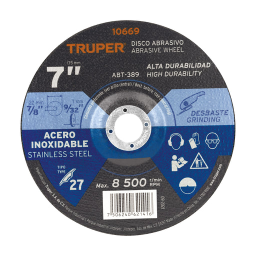 Disco Tipo 27 de 7' x 6.4 mm para desbaste de metal, Truper 12567 ABT-999