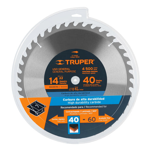 Disco sierra 14' para madera, 40 dientes centro 1', Truper 18322 ST-1440E