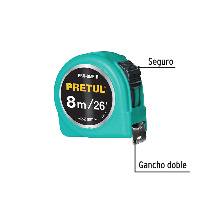 Flexómetro verde 8 m cinta 25 mm, en tarjeta, Pretul 29999 PRO-8ME-R